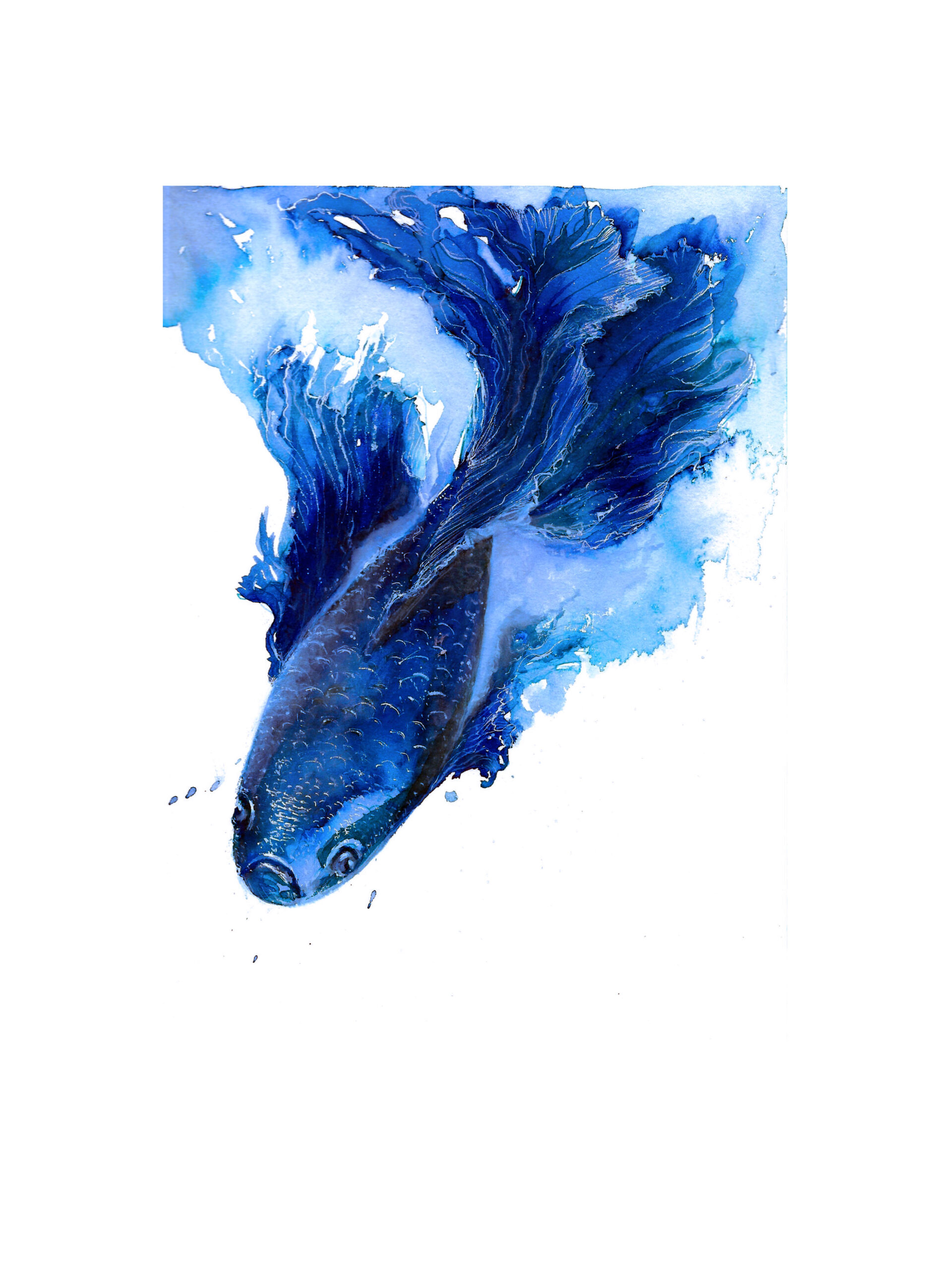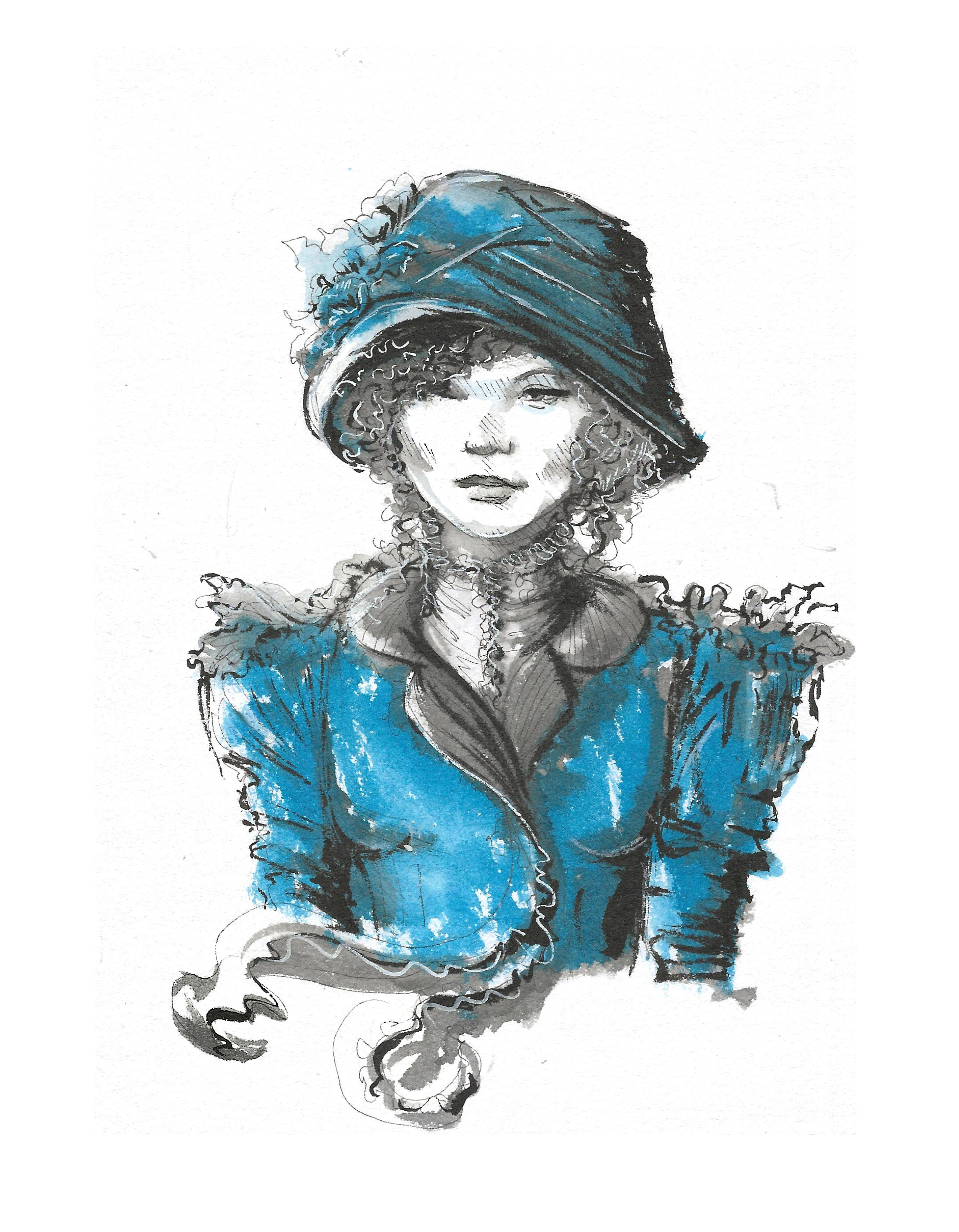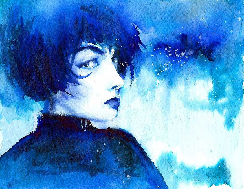 Au départ, l’objectif est de travailler les valeurs et les ombres, en n’utilisant qu’une seule couleur. Habituellement, j’utilise toutes sortes de pigments pour réaliser mes colorisations. Et cette association de nuances d’encres bleu de Chine, de la marque Sennelier, me convient parfaitement pour cette expérimentation. Bien entendu, de nombreuses autres marques peuvent être utilisées, mais j’ai un petit coup de cœur pour ces bleus particulièrement lumineux.