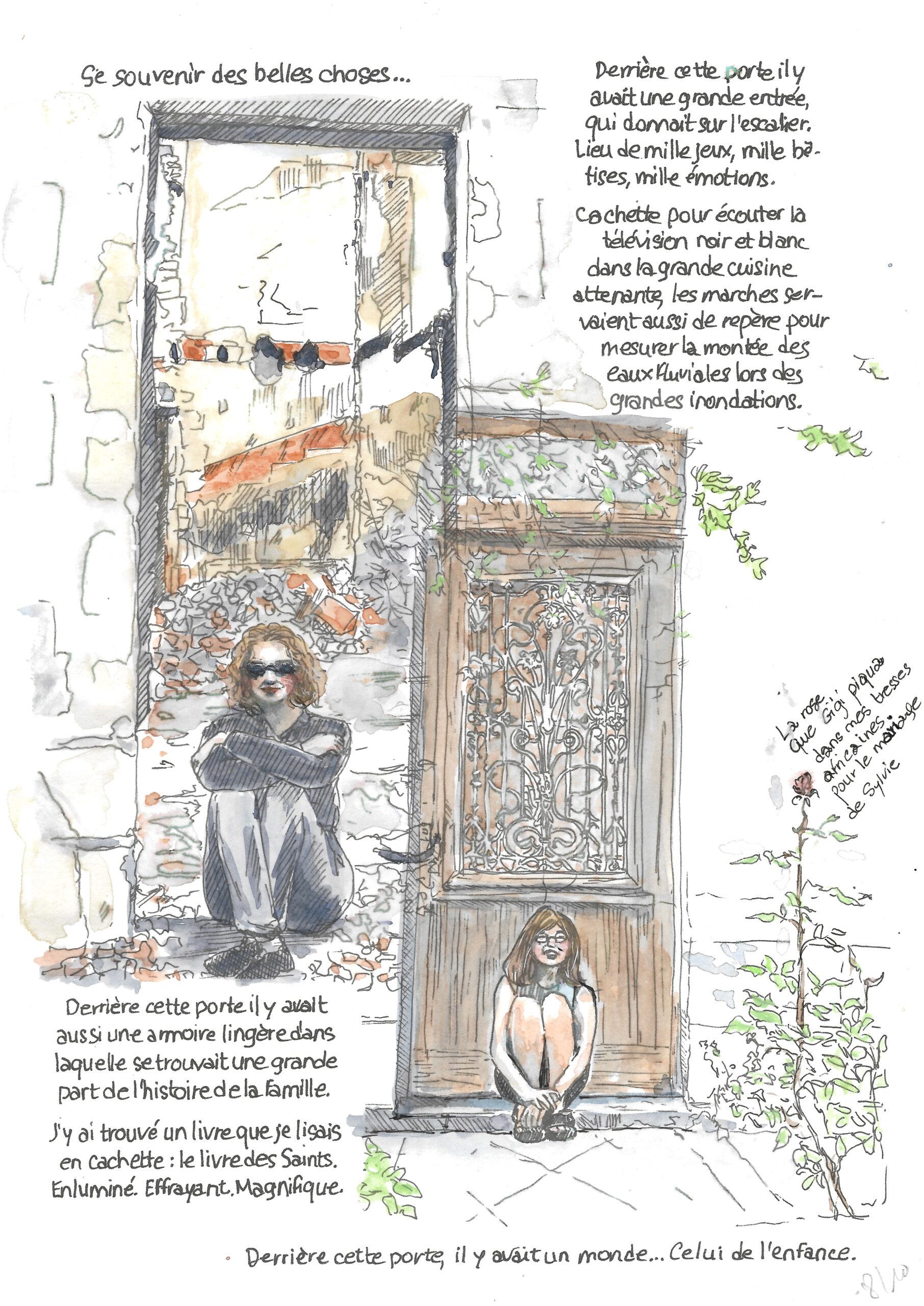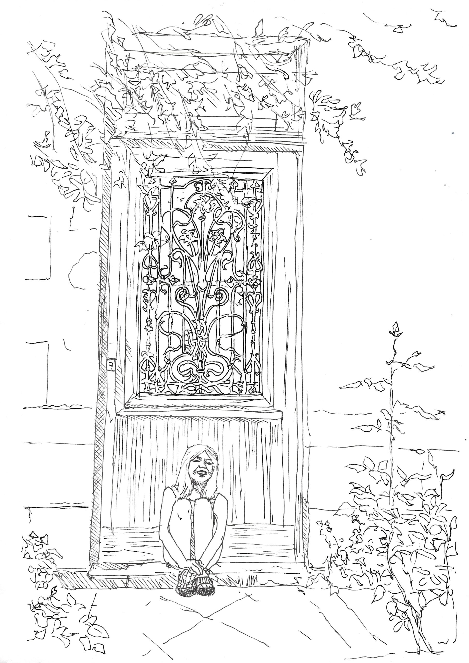 Après un premier croquis réalisé à main levée, j’ai colorisé au feutre à alcool, puis retravaillé l’ensemble en numérique afin de créer cet effet de foisonnement du décor de fond et de créer une variante de style de mon trait traditionnel noir d’encre.