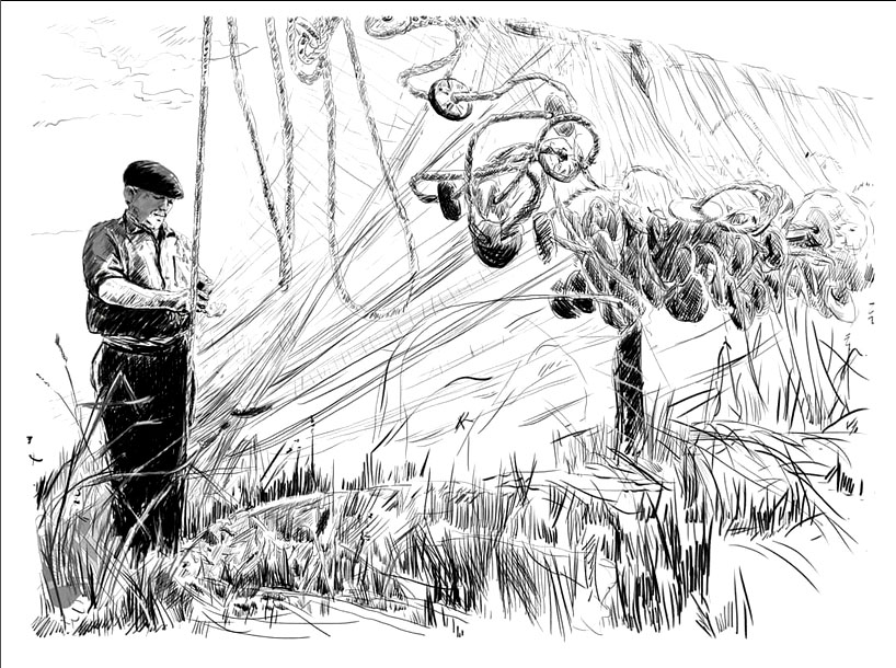 Le point de départ de ce dessin est une série de photos noir et blanc réalisé par le journal Sud Ouest pour accompagner un article présentant le métier de pêcheurs à l’alose en Garonne.