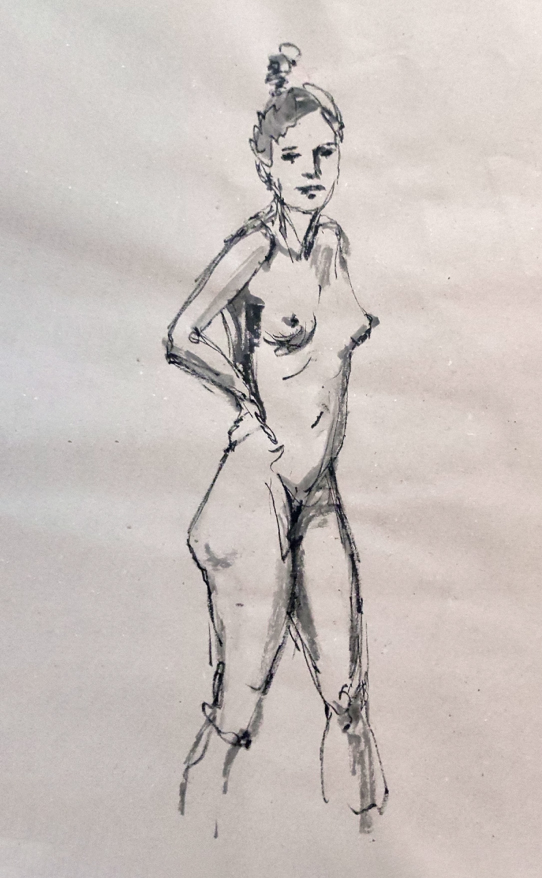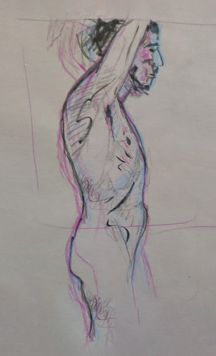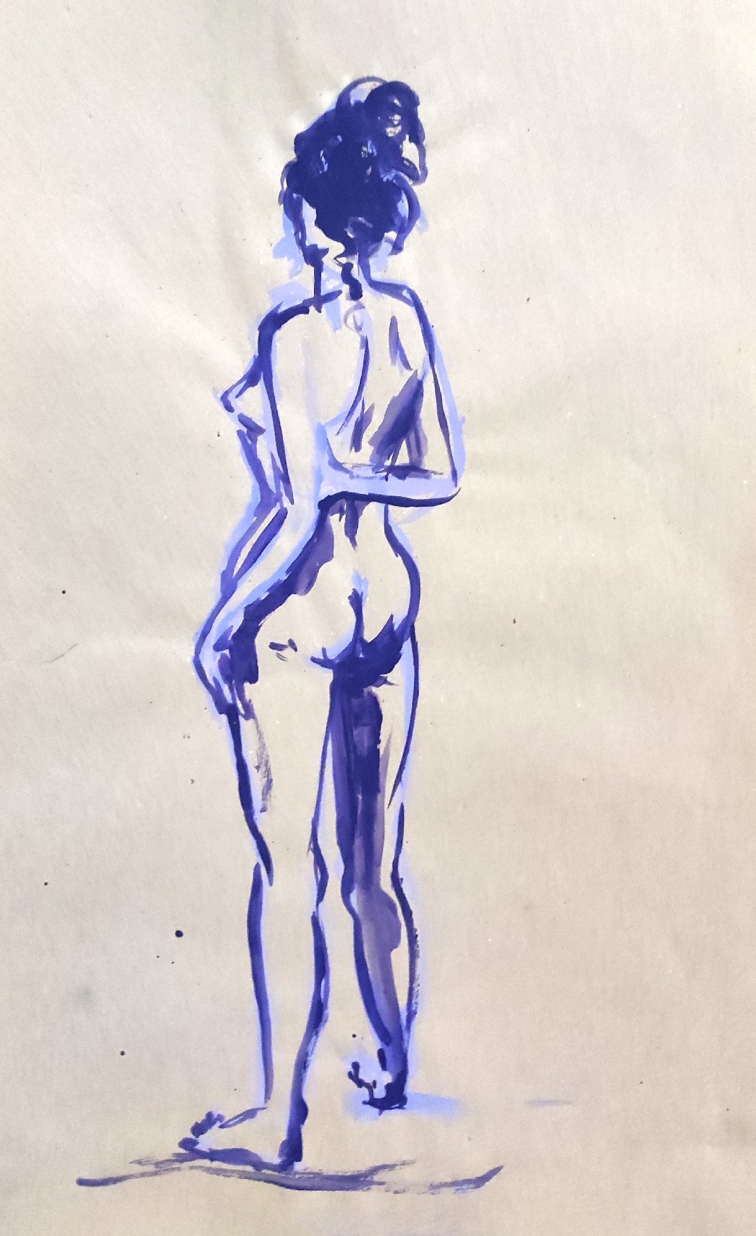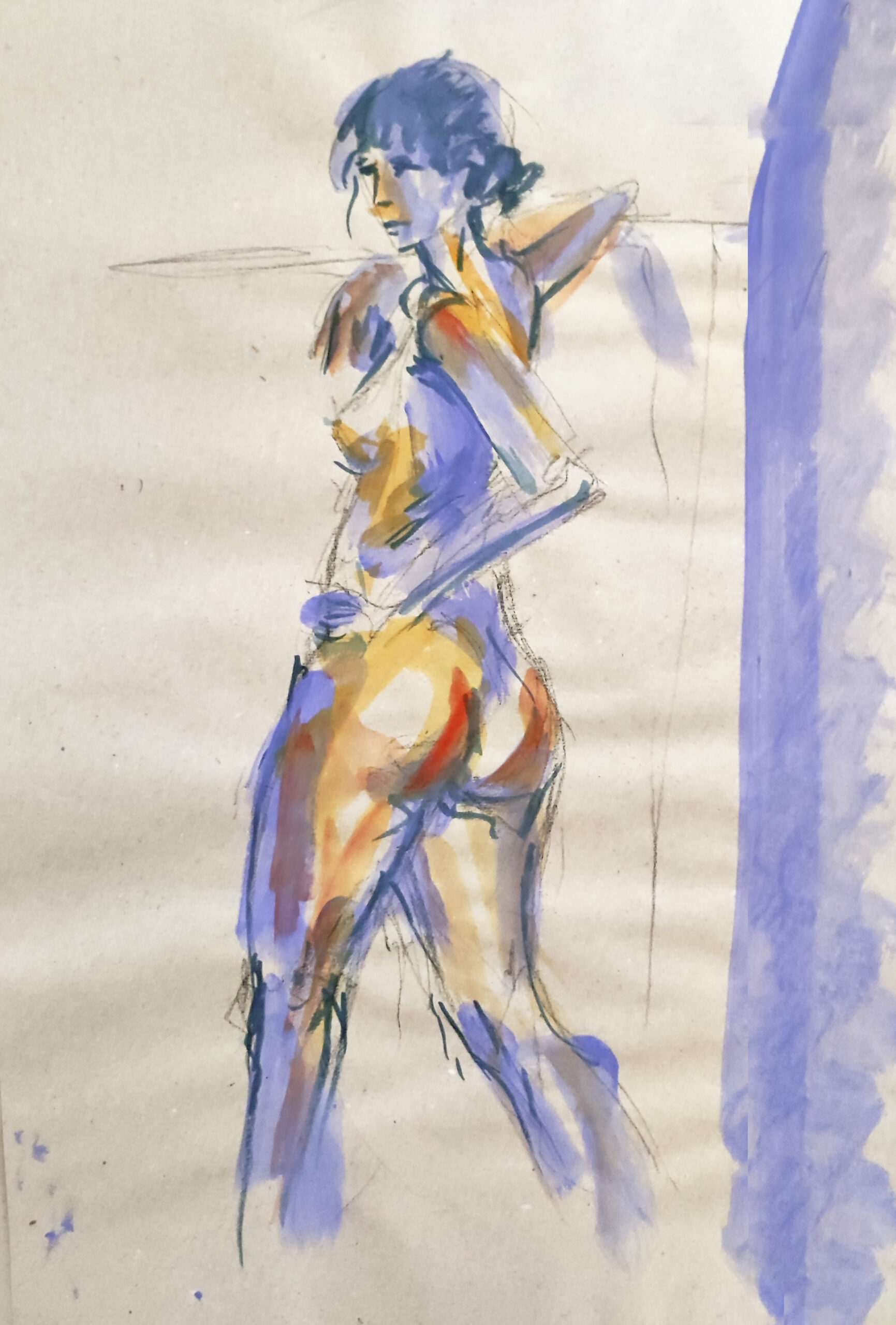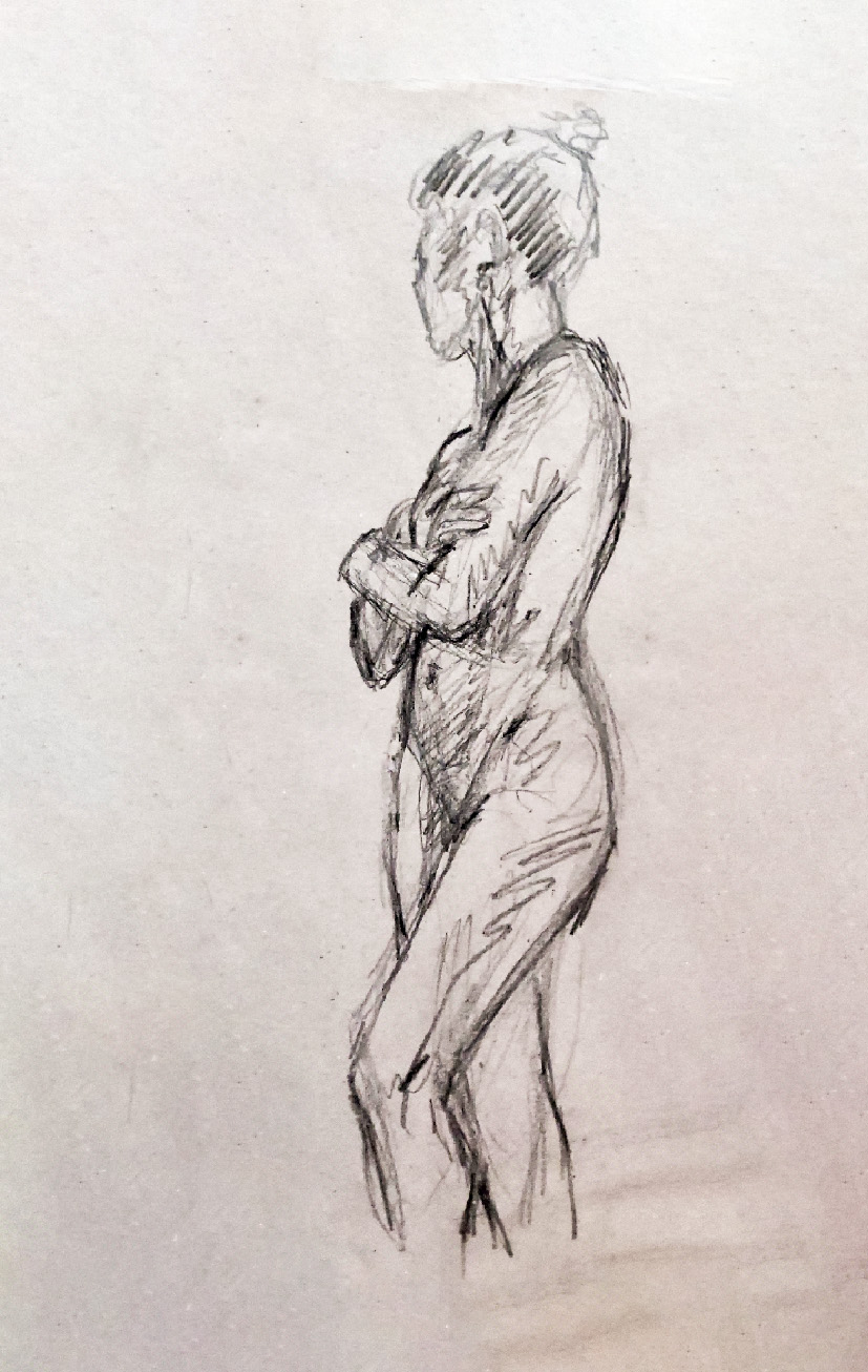 Depuis 2021, je participe à un atelier de dessins de modèles vivants tous les lundis. Selon un rituel bien calibré qui consiste à dessiner en 2, 5, 10, 15 ou 20 minutes, ce qui permet d’acquérir une forme d’automatisme et la rapidité de la prise de repères. Le lâcher prise est alors la règle, et la connexion totale avec le sujet dessiné.